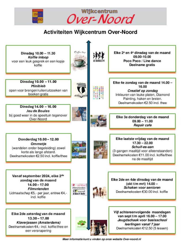 Dinsdagmorgen inloop Elke dinsdag van 10.00 uur tot 11.30u is in het Wijkcentrum Over-Noord een gezellige inloopochtend met koffie/thee. Tevens is dan de bibliotheek geopend. En het is gezellig druk. Komt u ook aan voor een kopje koffie en een wolkje gezelligheid?